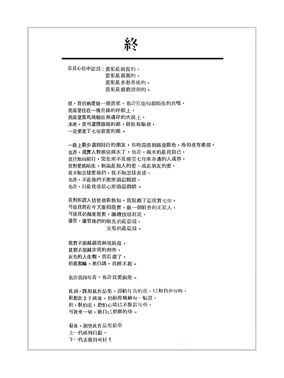 鳳凰成就了自己特别的生命,已化作一團火焰,經歷劫難,燃燒成灰燼,散落在另一個遙遠的地方,尋找自由與生命重新的契機。