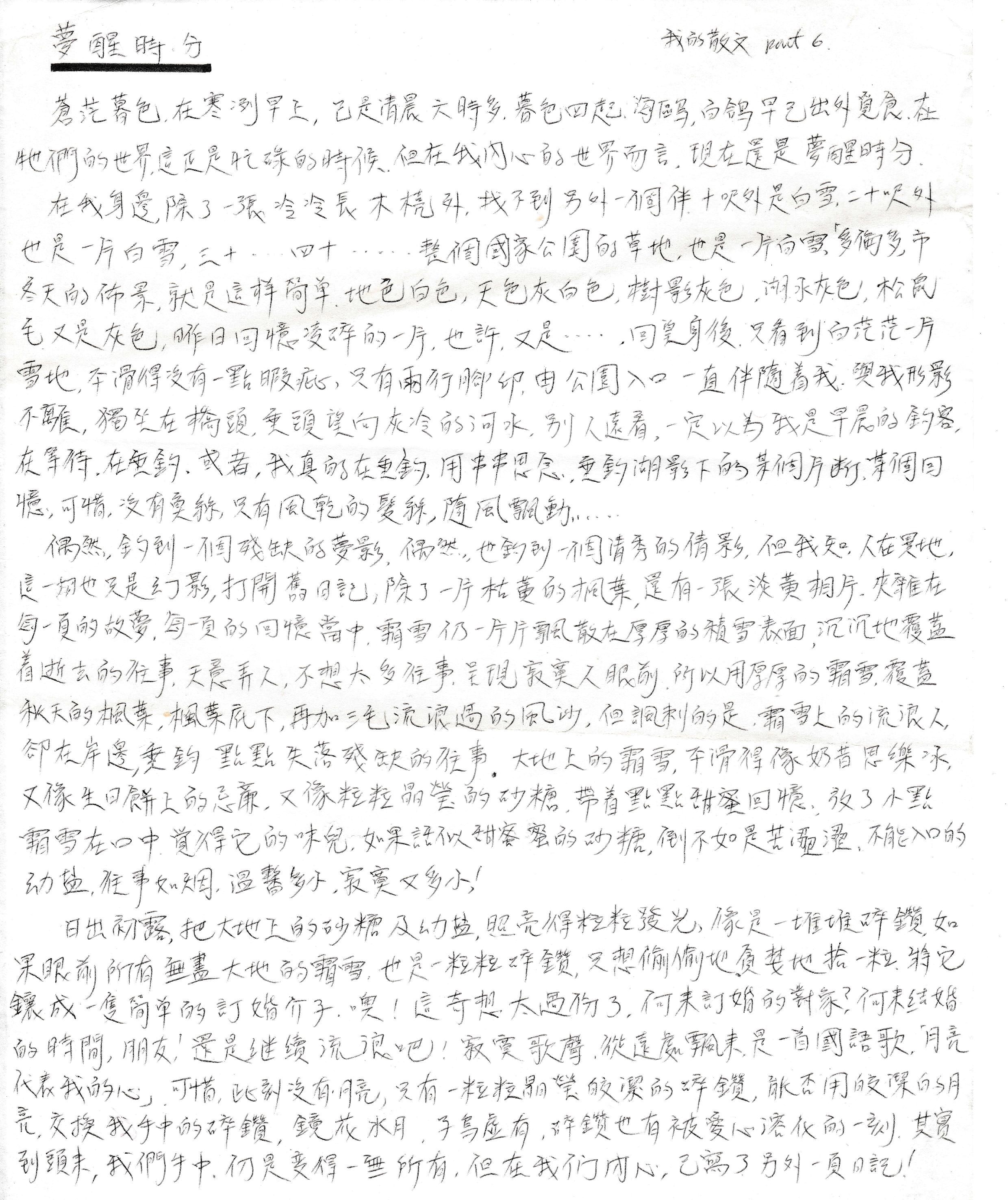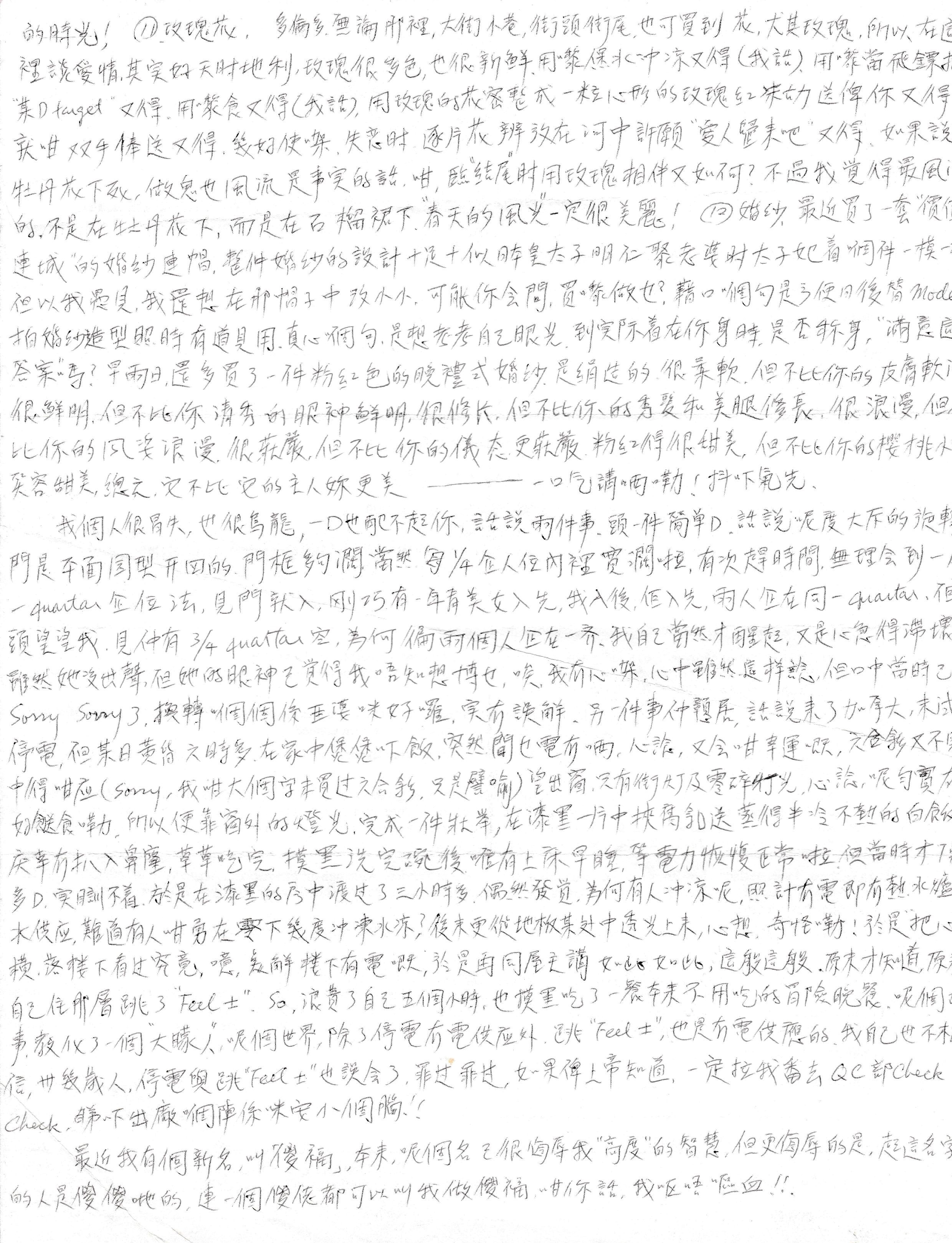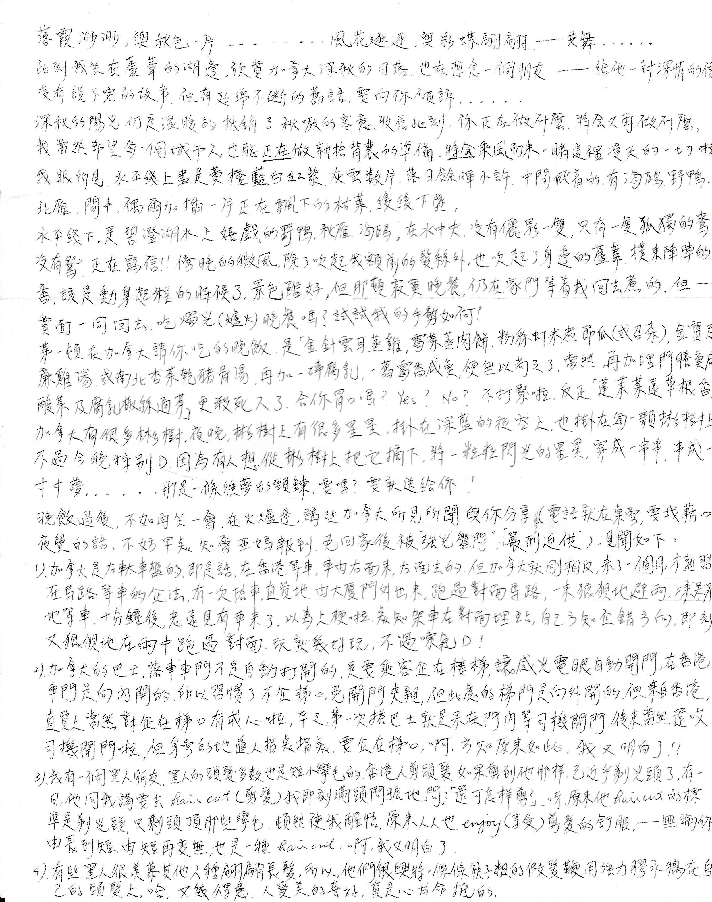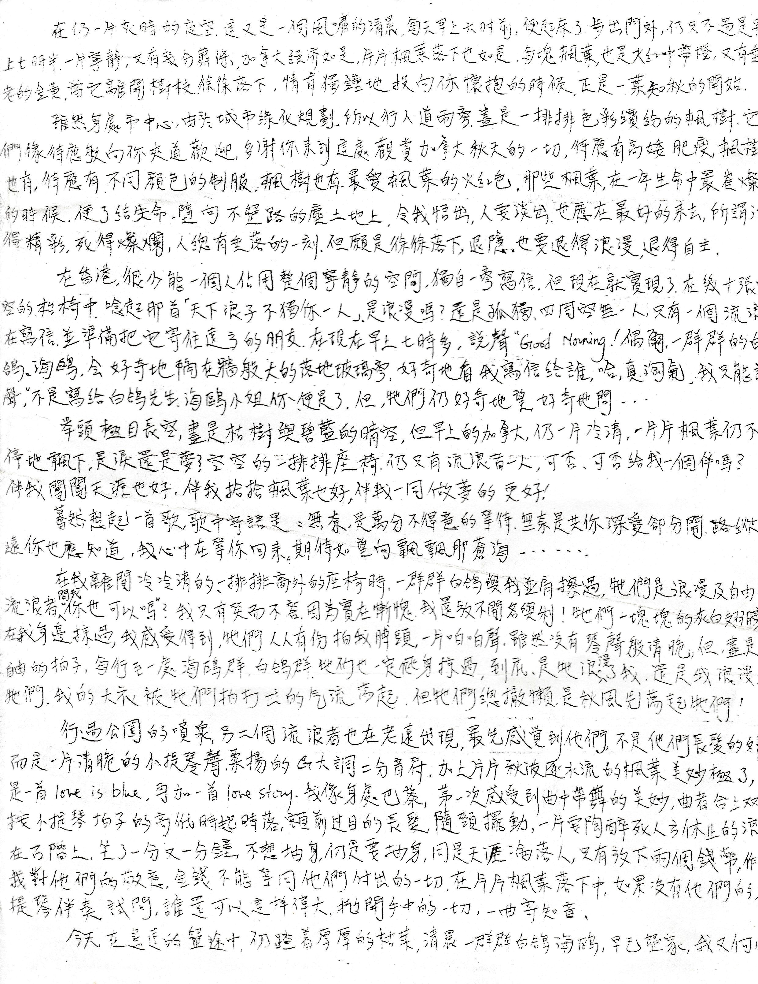 在香港很少能一個人佔用整個寧靜的空間,獨自一旁寫信,但現在就實現了,在幾十張空空的枱椅,唸起那首「天下浪子不獨你一人」是浪漫嗎﹖還是孤獨。四周空無一人,只有一個流浪者在寫信,並準備把它寄往遠方的朋友,在現在早上七時多,說聲"GOOD MORNING"﹗ 偶爾一群群的白鴿海鷗,會好奇地隔在牆般大的落地玻璃旁,好奇地看我寫信給誰﹗哈...真淘氣,我只能說聲,不是寫給白鴿先生,海鷗小姐你,便是了。但...牠們仍好奇地望,好奇地問...