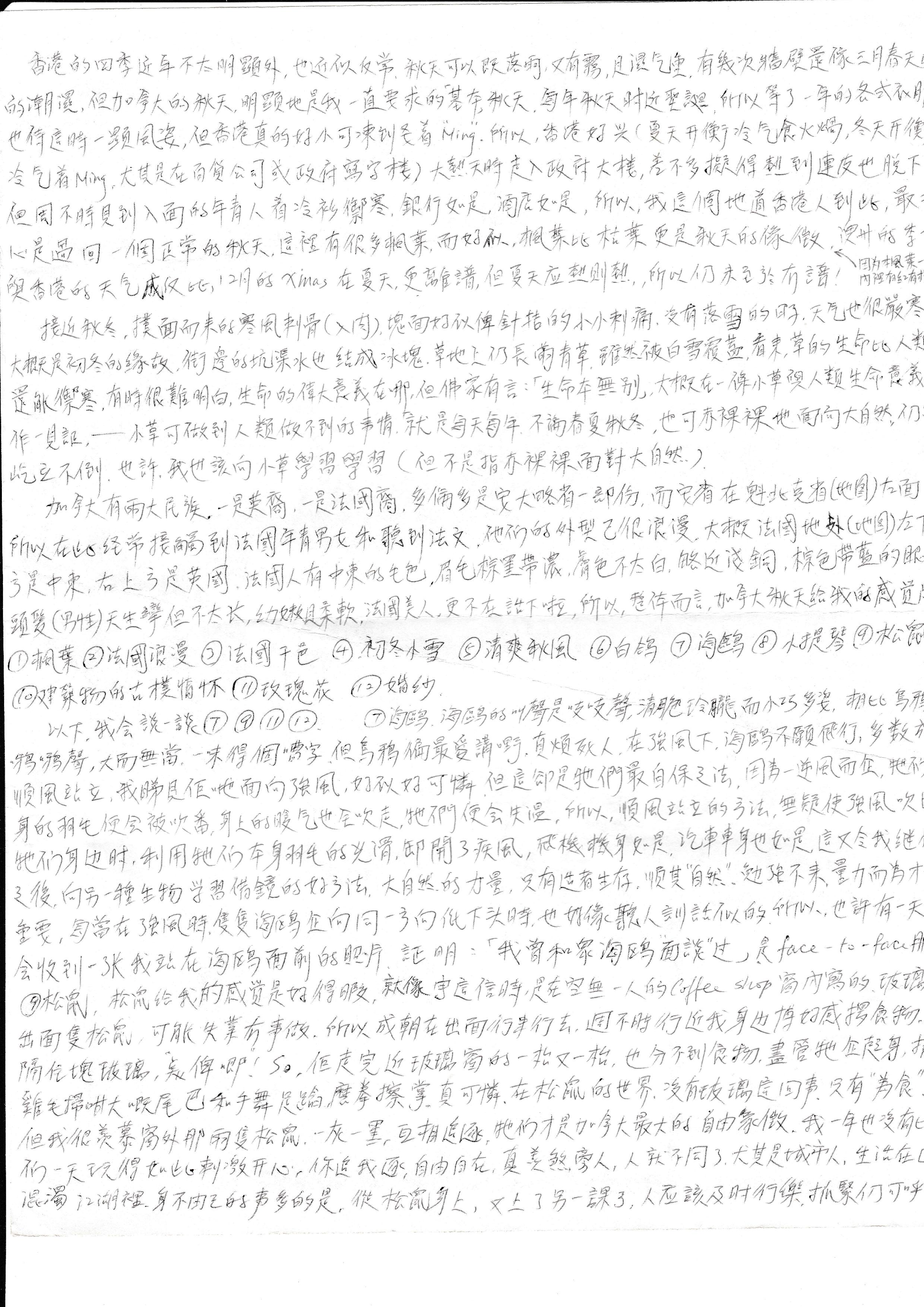 在我離開冷冷清,一排排窗外的座椅時,一群群白鵒與我並肩擦過,牠們是浪漫及自由的流浪者,問我,你也可以嗎﹖我只有笑而不答,因為實在慚愧,我還放不開名與利﹗牠們一塊塊的灰白翅膀,在我身邊掠過,我感受得到,牠們隻隻都有份拍我膊頭,一片啪啪聲,雖然沒有琴音般清脆,但盡是自由的拍子。每行至每一處海鷗群,白鴿群,牠們也一定飛身掠過,到底﹖是牠浪漫了我﹖還是我浪漫了牠們。我的大衣被牠們拍出的氣流蕩起,但牠們總撤懶,是秋風先蕩起牠們,